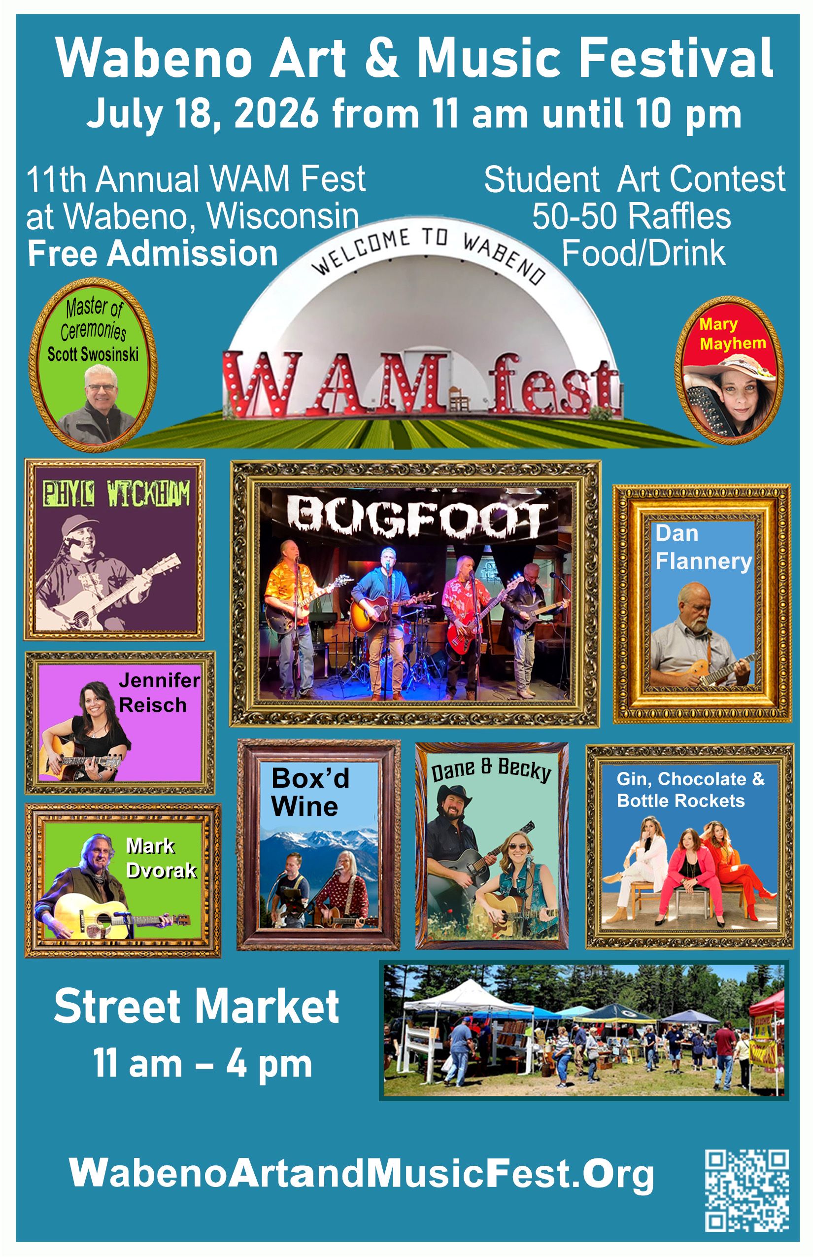 WAM Fest is an outdoor free event held on the Wabeno Band Shell and Logging Museum grounds. The 2026 Fest will feature a Street Market offering 30+ booths for vendors, a Student Art Contest from area school districts, food trucks, and 9 musical performances from local, regional and out-of-state performers.